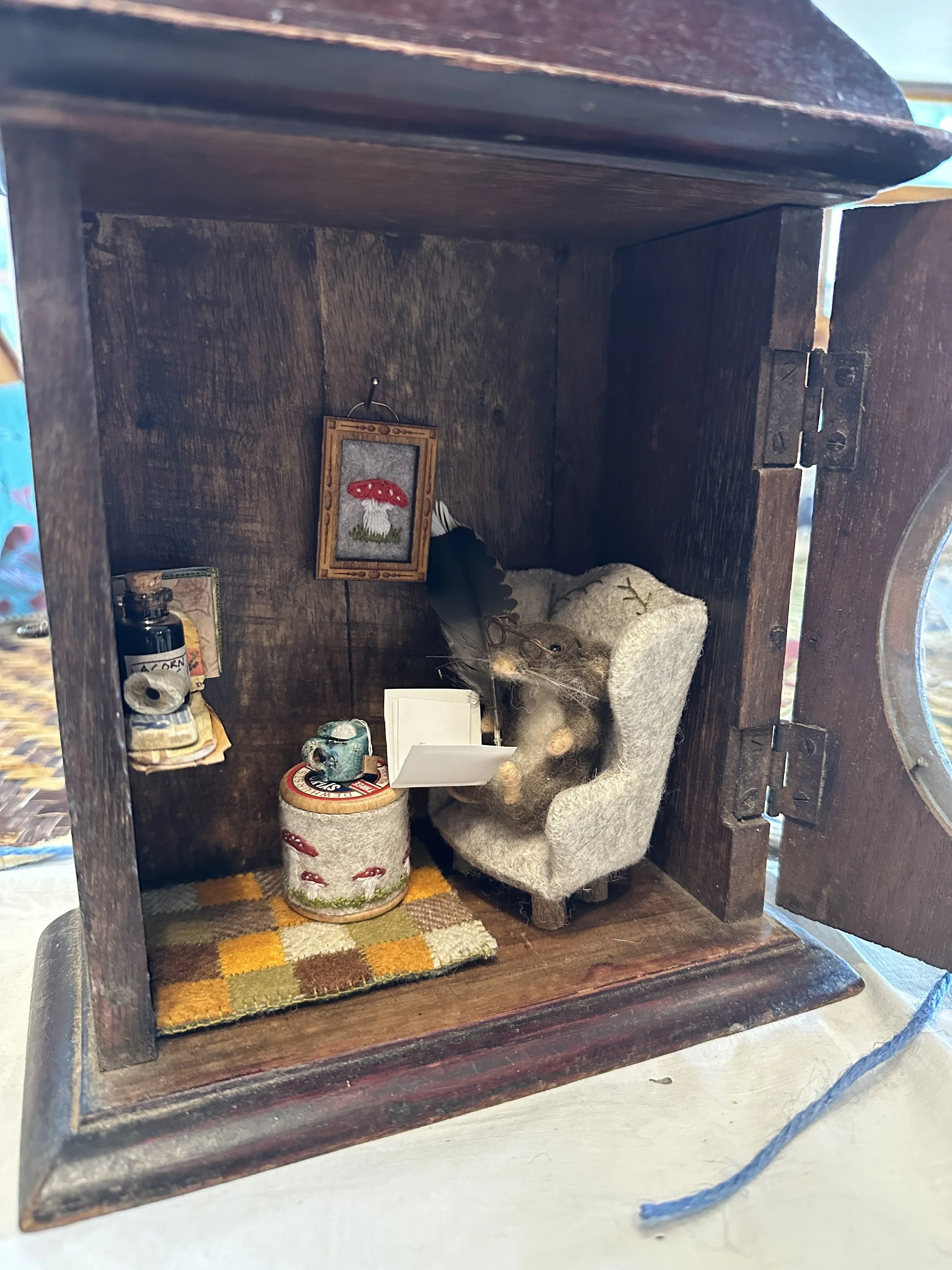 Certainly an heirloom piece. Housed in a vintage clock case that has a door your can peep through or open to find the scene inside. A shelf of books, light up poppy light, wall hanging, toy basket with a wish gatherers rabbit and a ball, thimble bedside table with a raku fired mug, embroidered bed with stars, pillow and tiny patchwork quilt, hot water bottle, slippers and a tiny copy of the book. A needle punched rug on the floor.