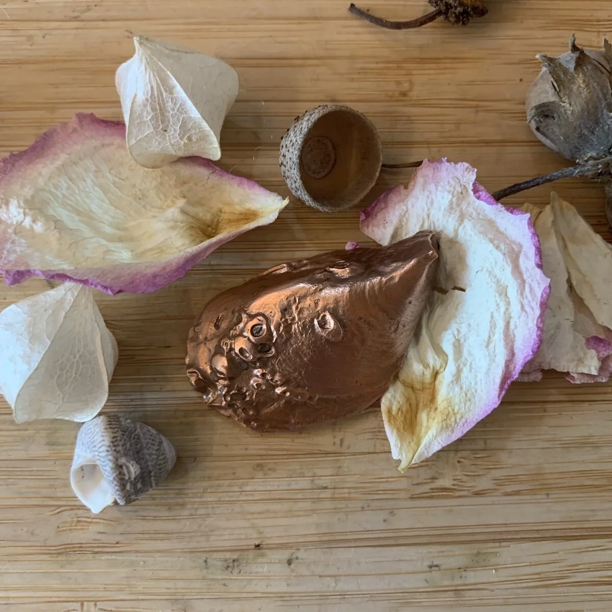 I collect nature finds and make moulds of them and then cast them in copper. They are therefore lifesize (though the copper shrinks the mould by 10%)